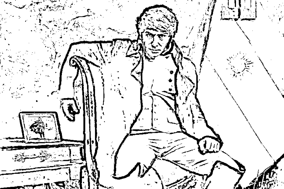 en la misma postura que el personaje histórico francés en un óleo de 50×60 cm, pintado en 2025.